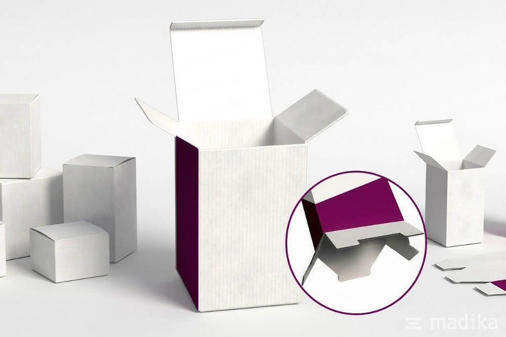 - Er besteht aus Wellpappe in verschiedenen Wellenarten (z. B. E-Welle, B-Welle oder Doppelwelle).