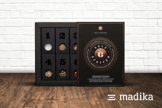 In diesem Beispiel besteht die Karton-Schachtel aus einem schwarzen Vollkarton, der zu einer Schiebeschachtel mit Hohlwand verarbeitet wurde. In Kombination mit edlen Highlights auf dem Deckel wurde daraus eine exklusive Geschenkverpackung im modernen Stil - und damit jeder Feinkartonage-Geschenkverpackung ebenbürtig!