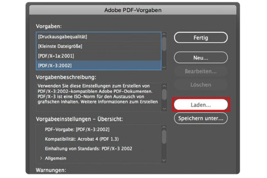 Arbeiten Sie im CMYK-Modus mit dem Profil Coated FOGRA39. Dafür klicken Sie in InDesign „Datei“ > „Adobe PDF-Vorgaben“ > „Definieren“. Im Fenster Adobe PDF-Vorgaben klicken Sie auf „Laden“ und wählen die von uns zur Verfügung gestellte Datei „madika_PDF-Export.joboptions“ aus.