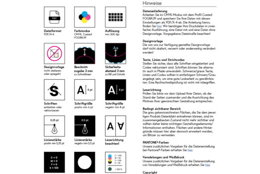 Bei der Gestaltung sollten Sie darauf achten, die von uns zur Verfügung gestellte Designvorlage nicht zu skalieren oder zu spiegeln. Die Auflösung von Bildern sollte mindestens 300 dpi betragen. Texte, Linien und Strichcodes sollten eingebettet oder in Pfade umgewandelt werden. Für Schriften empfehlen wir eine Mindestgröße von 6 pt (bzw. 8 pt bei Negativlinien). Linien sollten mindestens 0,25 pt dick sein (bzw. 0,5 pt bei Negativlinien). Alle weiteren Vorgaben entnehmen Sie bitte der Checkliste zur Druckdatenerstellung.